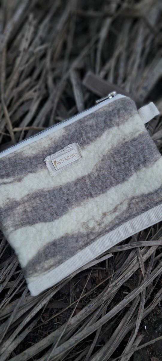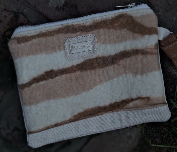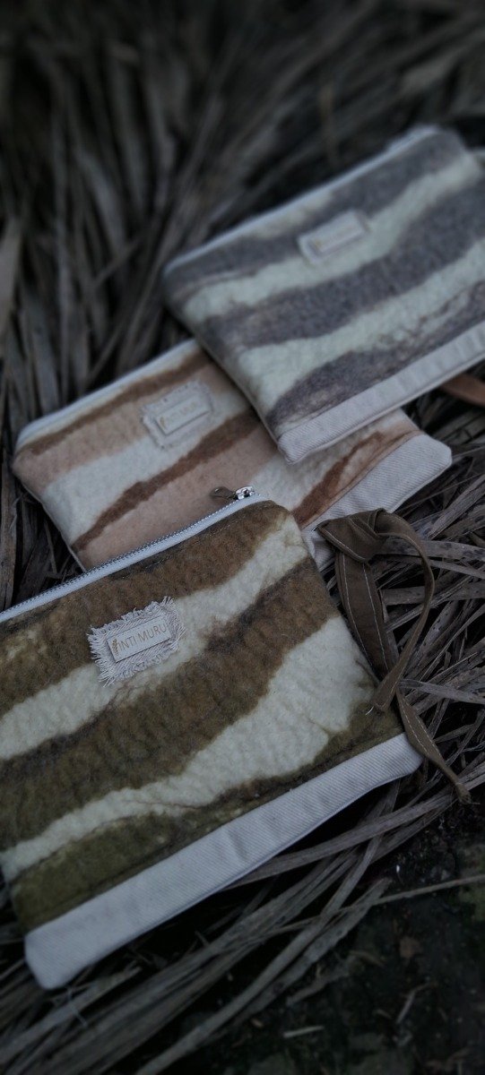 Cada estuche es una pieza única, confeccionada artesanalmente con fieltro intervenido mediante la técnica de teñido natural, utilizando corteza de eucaliptus, yerba mate y vellon con su color propio. La base en gabardina le aporta firmeza y durabilidad, mientras que el diseño orgánico de vetas y tonos terrosos refleja la esencia de lo natural.
