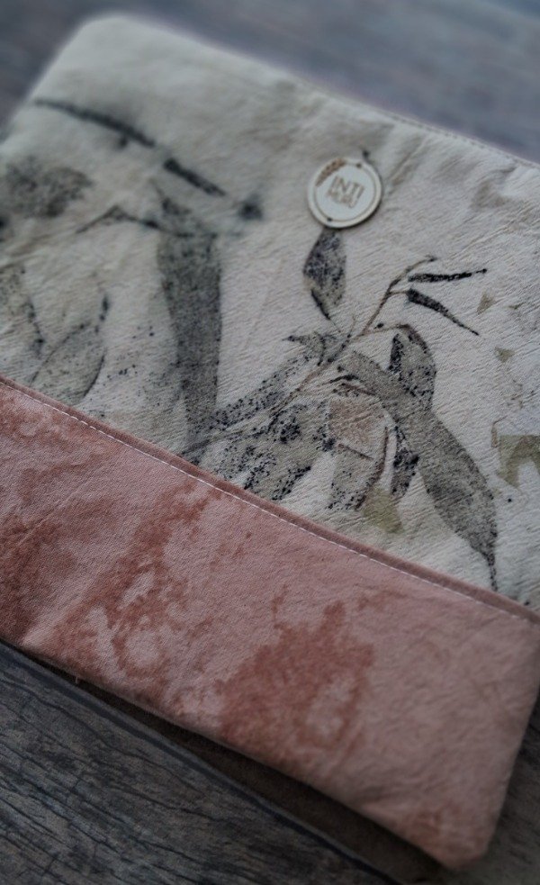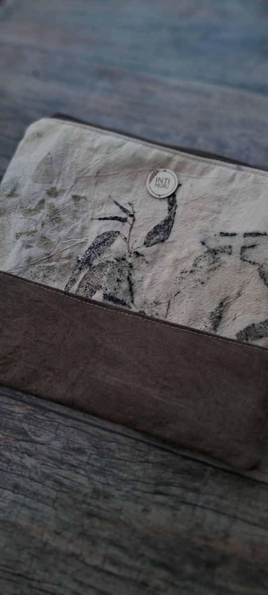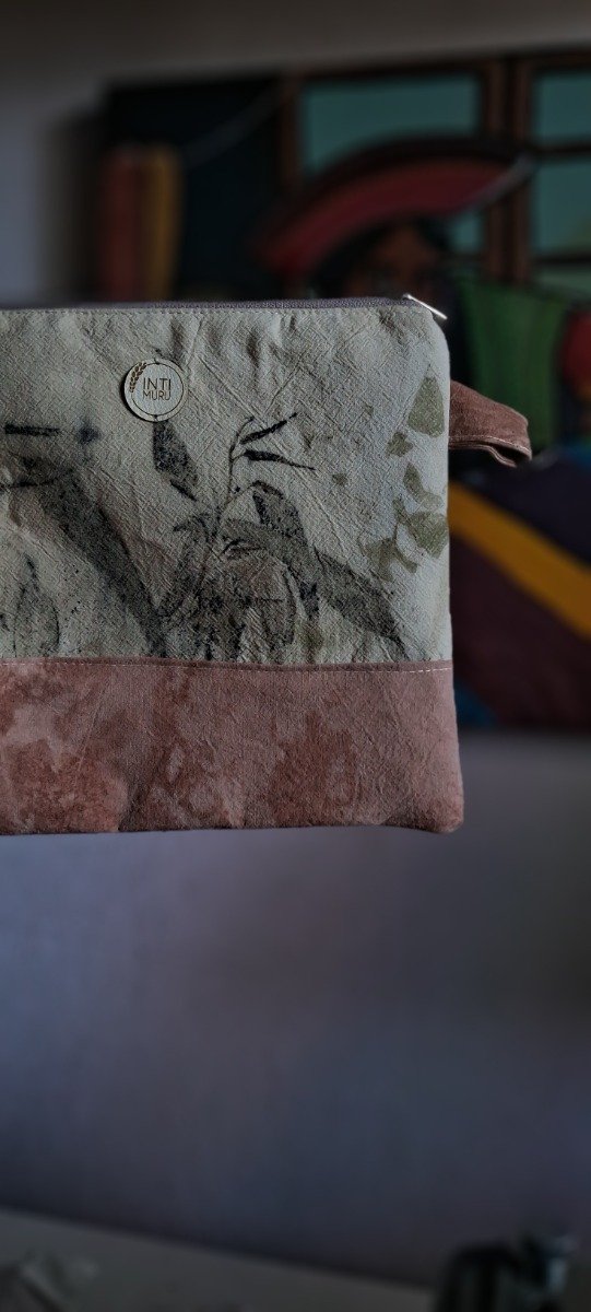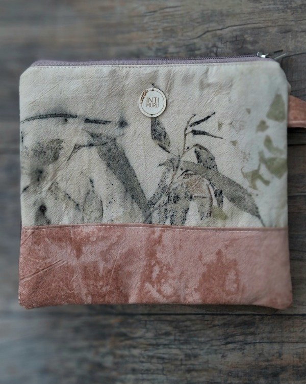 Este neceser fue creado de forma completamente artesanal, combinando técnicas ancestrales y contemporáneas. Su textil está intervenido con teñido natural y estampado botánico, donde cada hoja y color revela la huella de la tierra y el tiempo.