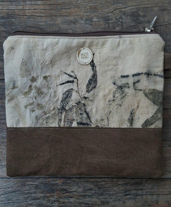 Material: Textil teñido y estampado con hojas, cierre metálico, forrado internamente con lienzo de algodon.
