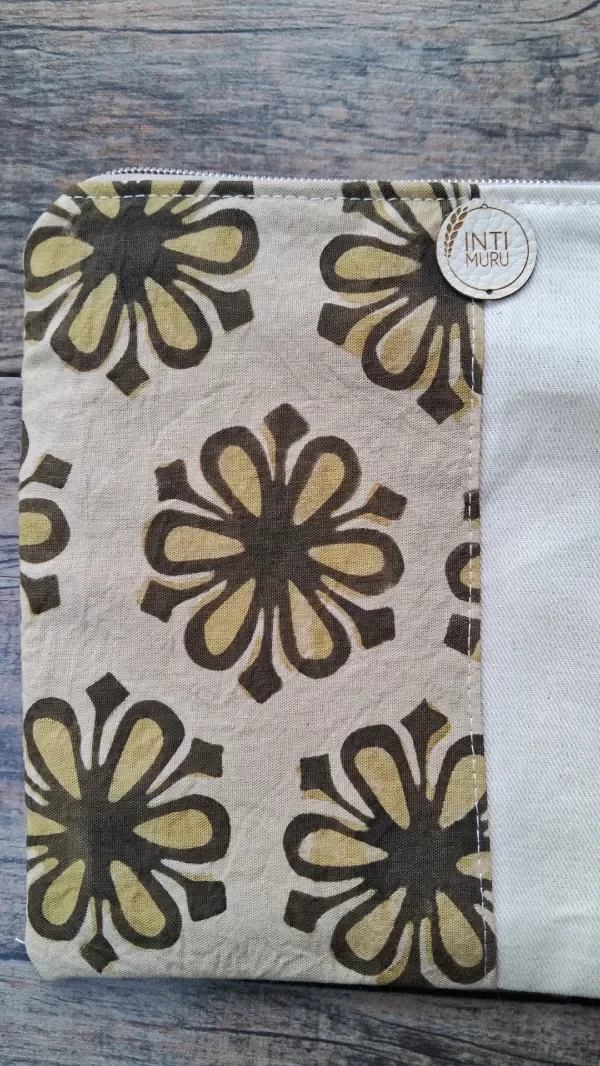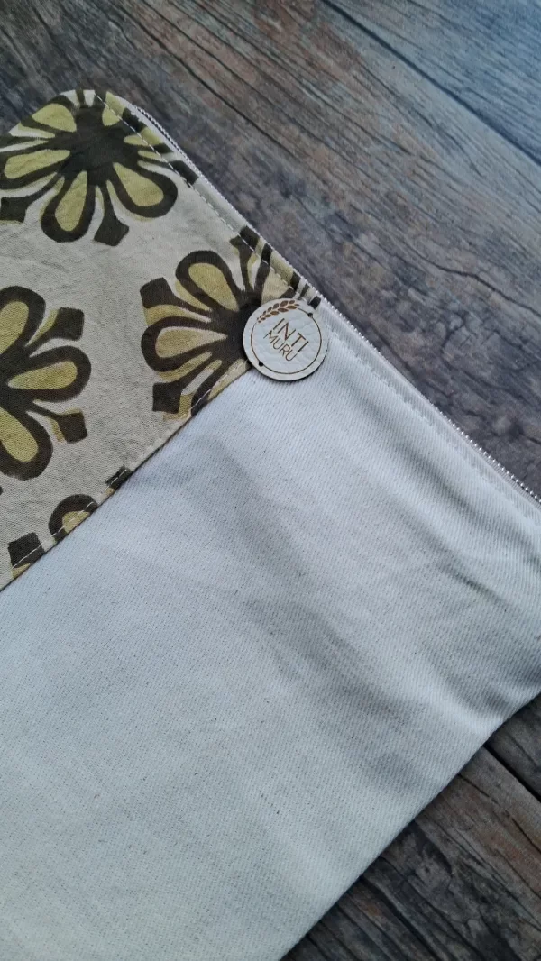 Cada neceser es una pieza única, confeccionada a mano en lienzo de algodón y gabardina, materiales nobles que aportan resistencia y textura. Las estampas son artesanales, aplicadas con técnicas manuales que imprimen formas orgánicas e imperfectas, propias del trabajo hecho a conciencia. Su formato tipo sobre lo hace práctico y versátil: ideal para organizar cosmética, papelería o llevar lo esencial en la cartera. Diseño simple, funcional y con sello propio.